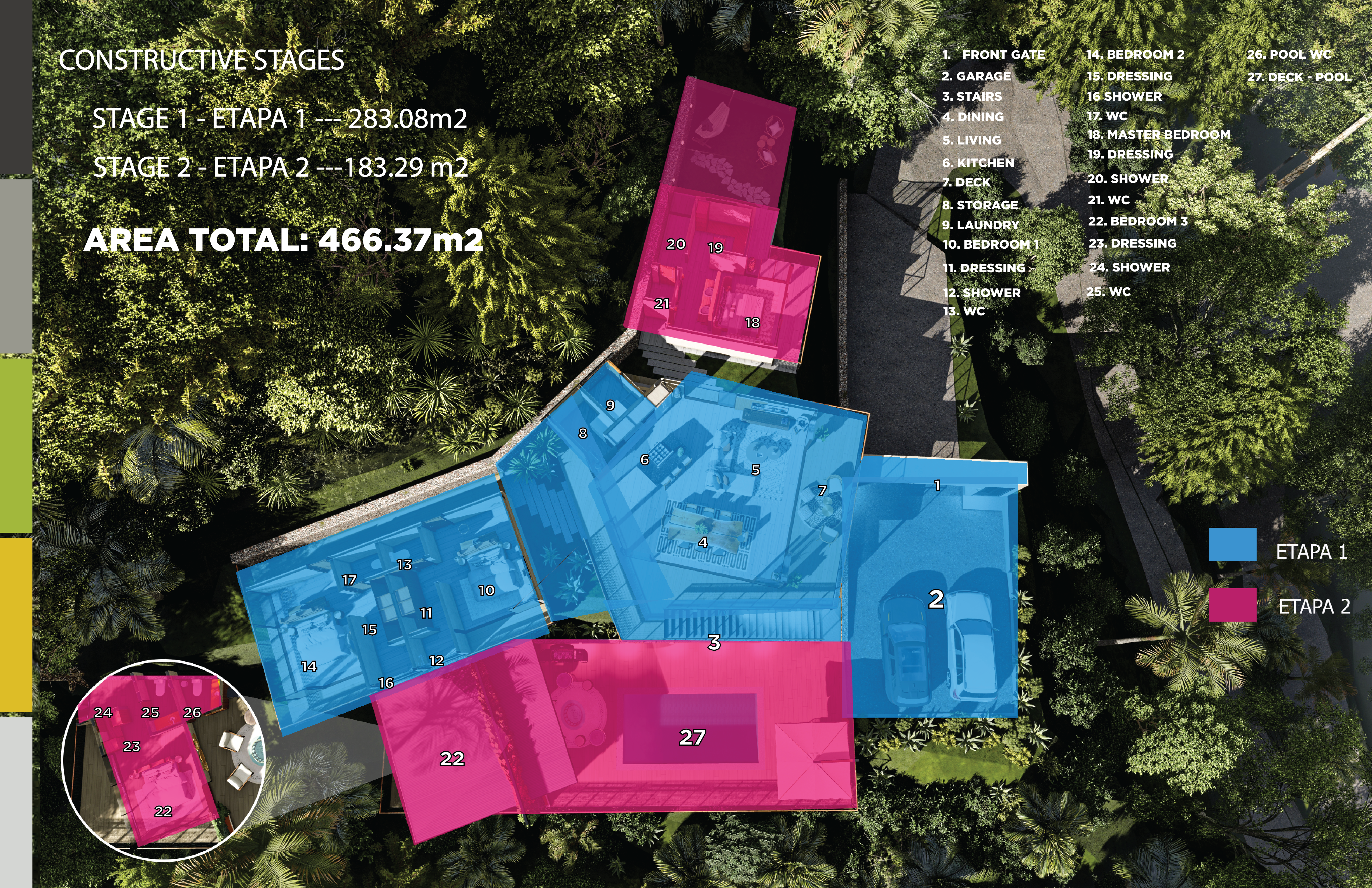 Casa Nayahana 2 es la reinterpretación contemporánea de Villa Nayahana, concebida para ajustarse al presupuesto del cliente sin sacrificar diseño, calidad ni experiencia espacial. Con 466.37 m², la vivienda se desarrolla en dos etapas constructivas y está pensada para construirse por módulos independientes, lo que permite al cliente habitarla parcialmente desde el inicio sin comprometer su funcionalidad ni coherencia espacial.